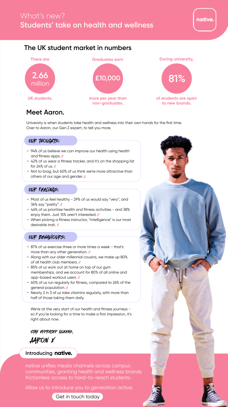There are 2.66 million students currently enrolled at UK universities. The majority are Gen Z - and on average, they’ll go on to earn £10,000 per year than their non-graduate peers. Having inherited spending power and shopping in new categories for the first time, 81% of students are open-minded to trying new brands and products. University is when students take health and wellness into their own hands for the first time. They're at the very start of their health and fitness journeys - so if you’re a brand looking for a time to make a first impression, it’s right about now. But first, get the top insights from our Gen Z student, Aaron. They include: